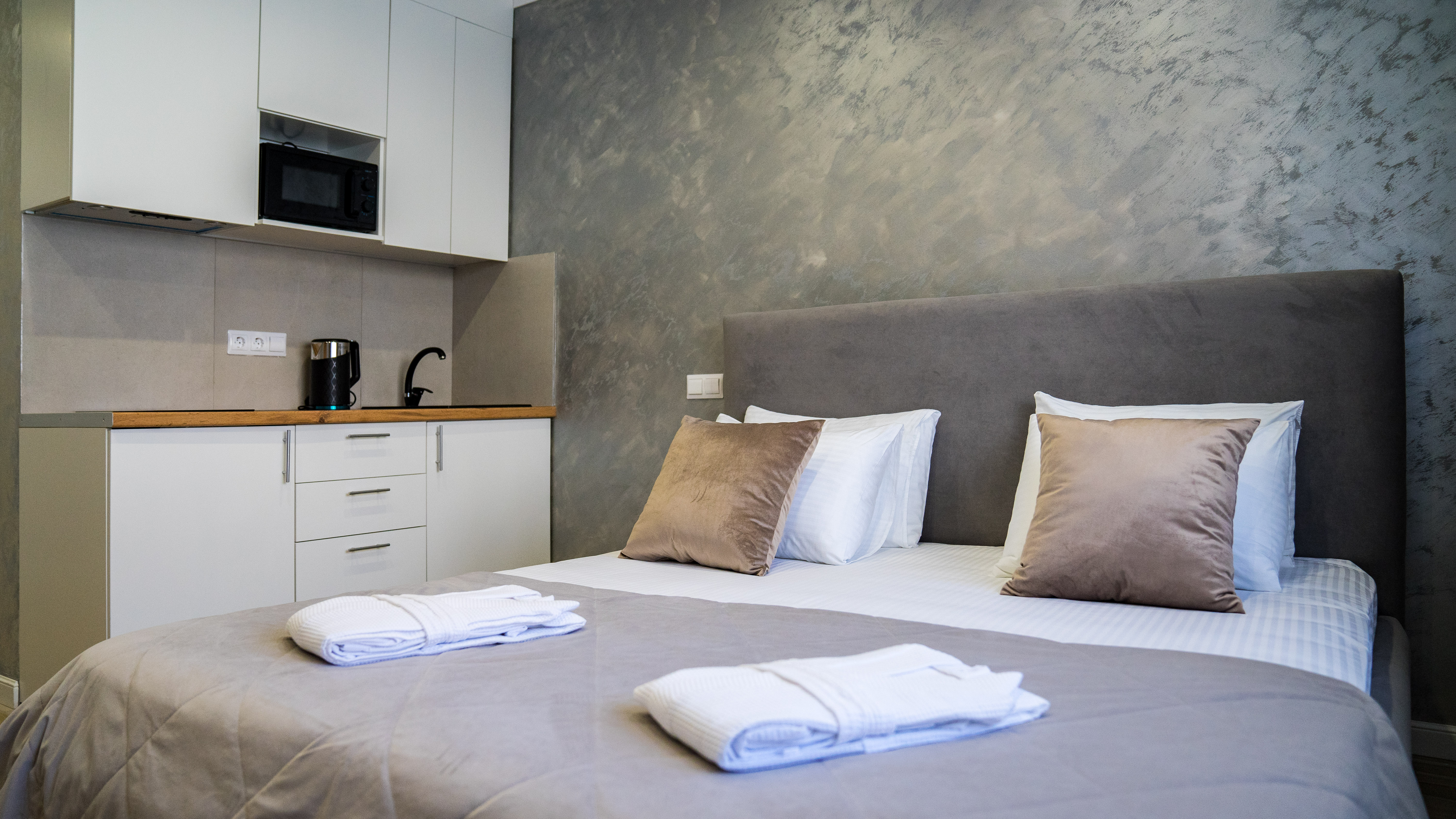| Комфорт Комфорт 3-местный | 23-25 кв.м. | 2 чел. | Мебель (вешалка, зеркало, кресло-кровать, кровать двуспальная, стол, стулья, шкаф-купе), Мини-кухня,... | |