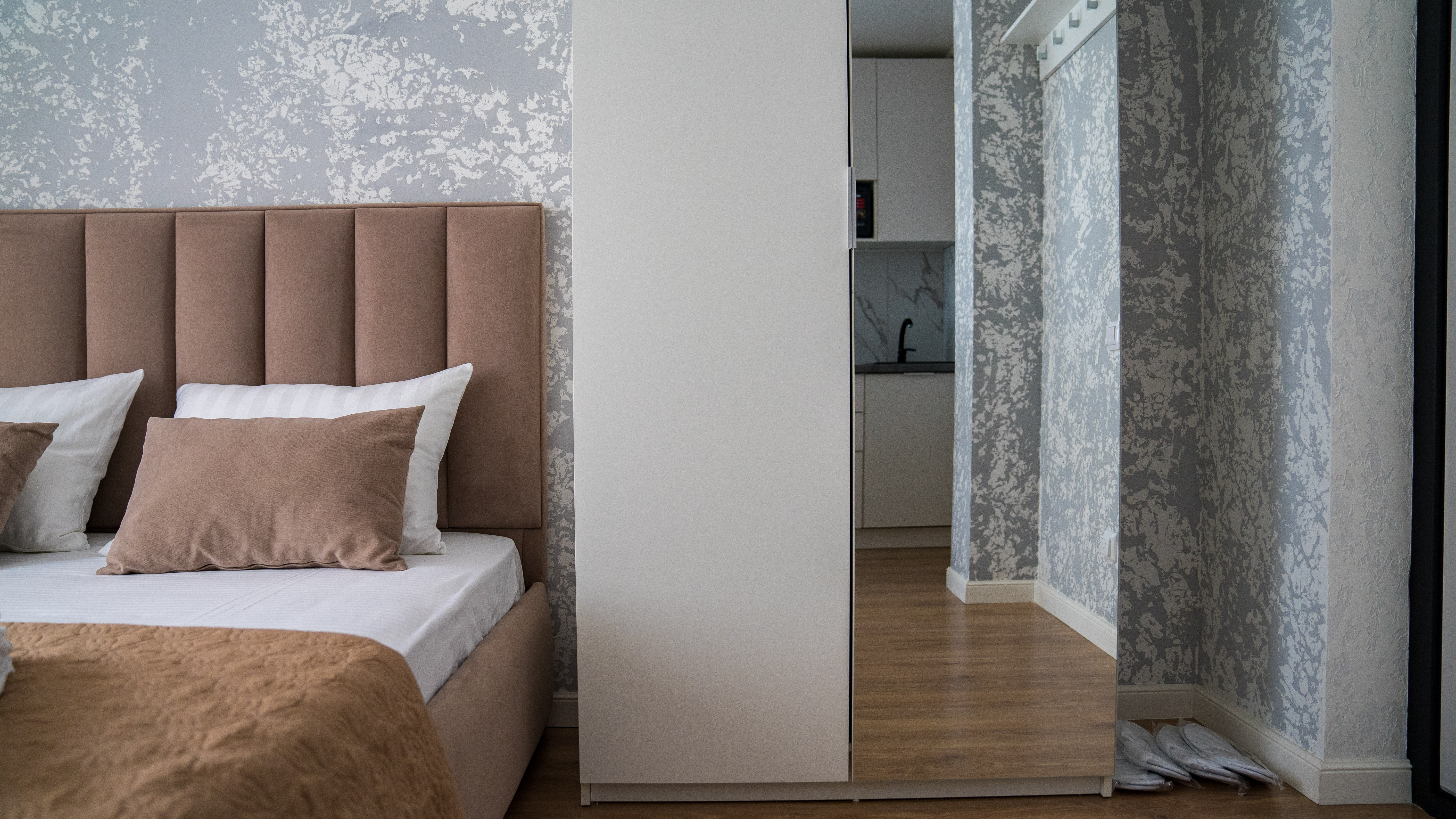 - Мебель: вешалка, зеркало, кровать двуспальная, стол, стулья, шкаф-купе